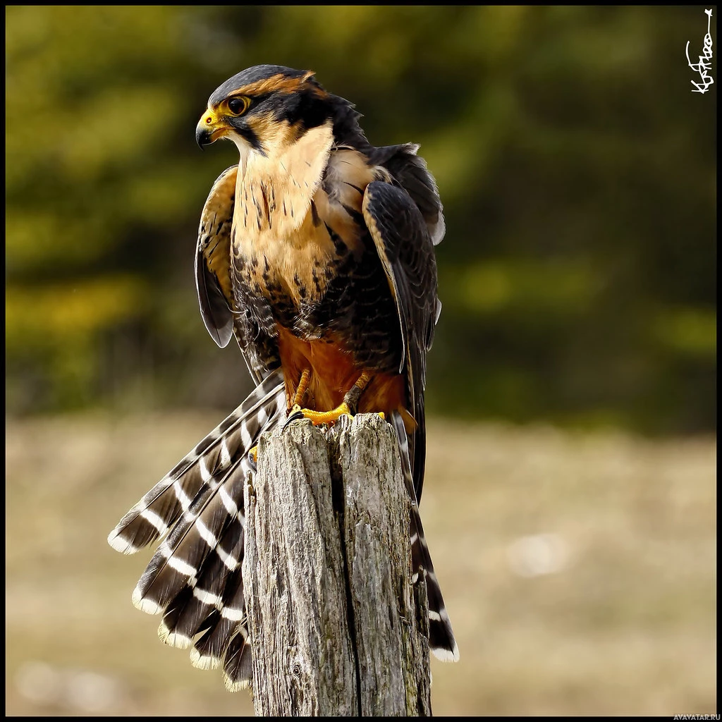 На картинке изображен сокол-сапсан, который является одним из видов птиц, известных своей скоростью и охотничьими навыками. Он сидит на вершине чего-то, похожего на деревянный столб забора, за которым растет трава. У этой птицы есть характерные приметы, такие как заостренные крылья и длинный хвост.
