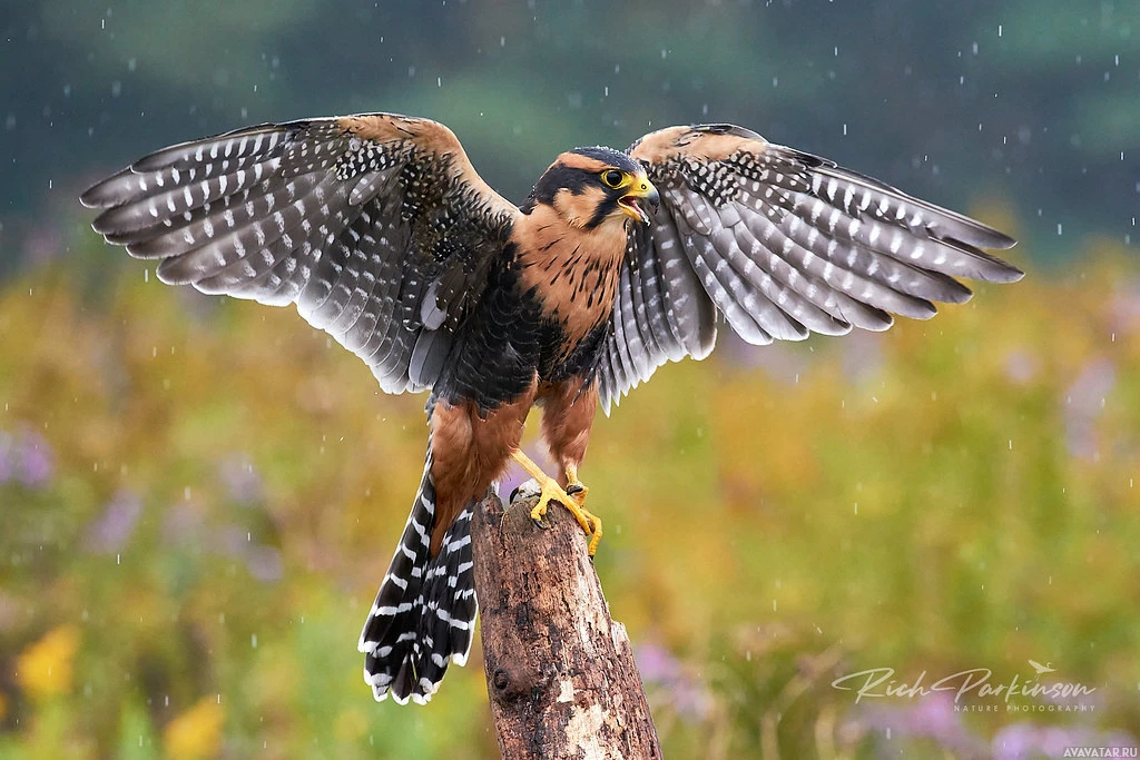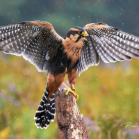 The image features a bird, specifically a hawk, perched on what appears to be a fence post or