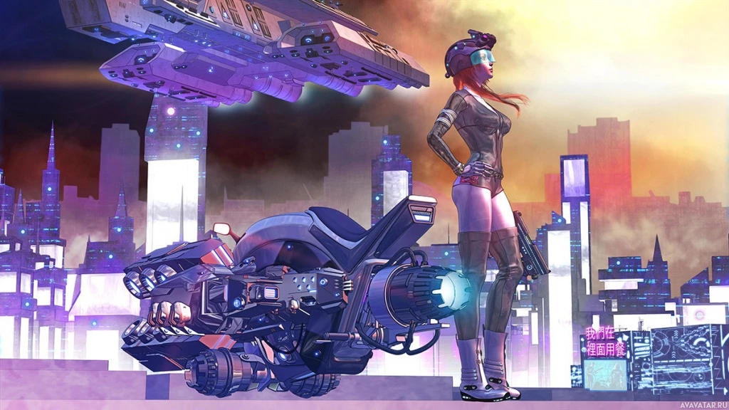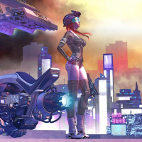 advanced technology or a high-tech environment: floating vehicles, buildings with neon signs, and a futuristic cityscape. The character's pose and the overall atmosphere of the picture suggest an action scene, possibly from