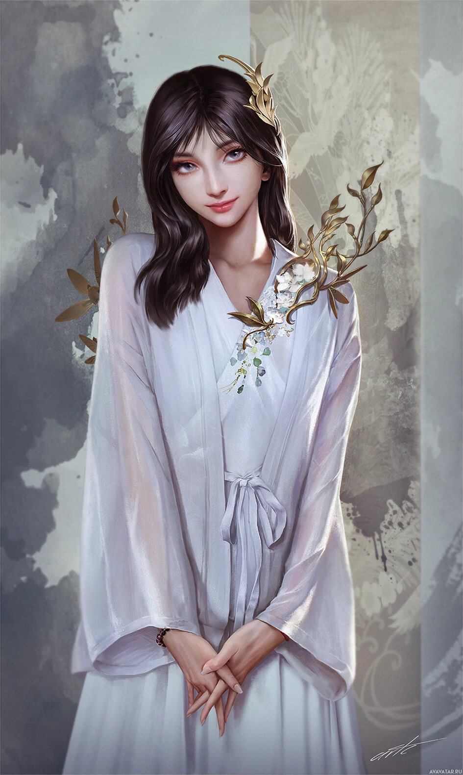 dark hair and is wearing a light-colored, flowing robe with intricate designs on it. There are delicate floral elements around her neckline that add to the ethereal or fantastical feel of her appearance. The background features a grayish color with