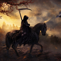 dark clothing with the appearance of death or the Grim Reaper. The setting is eerie and misty, with