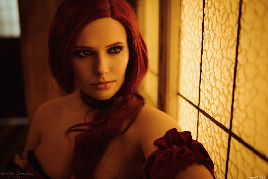 The image shows a woman with vibrant red hair styled in long strands, wearing what appears to be a costume inspired by the character Ciri from "The Witcher"