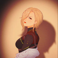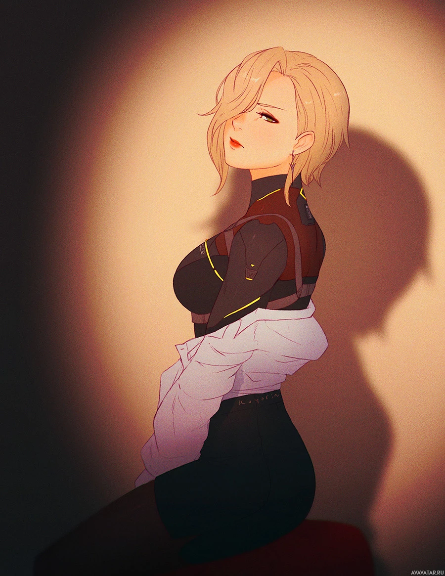 На картинке изображена анимационная героиня с короткими светлыми волосами, сидящая в тускло освещенной комнате с эффектом прожектора за спиной. Она одета во что-то похожее на школьную форму, и у нее эмоционально-рефлексивное выражение лица. Художественный стиль предполагает, что это может быть из аниме или манги.