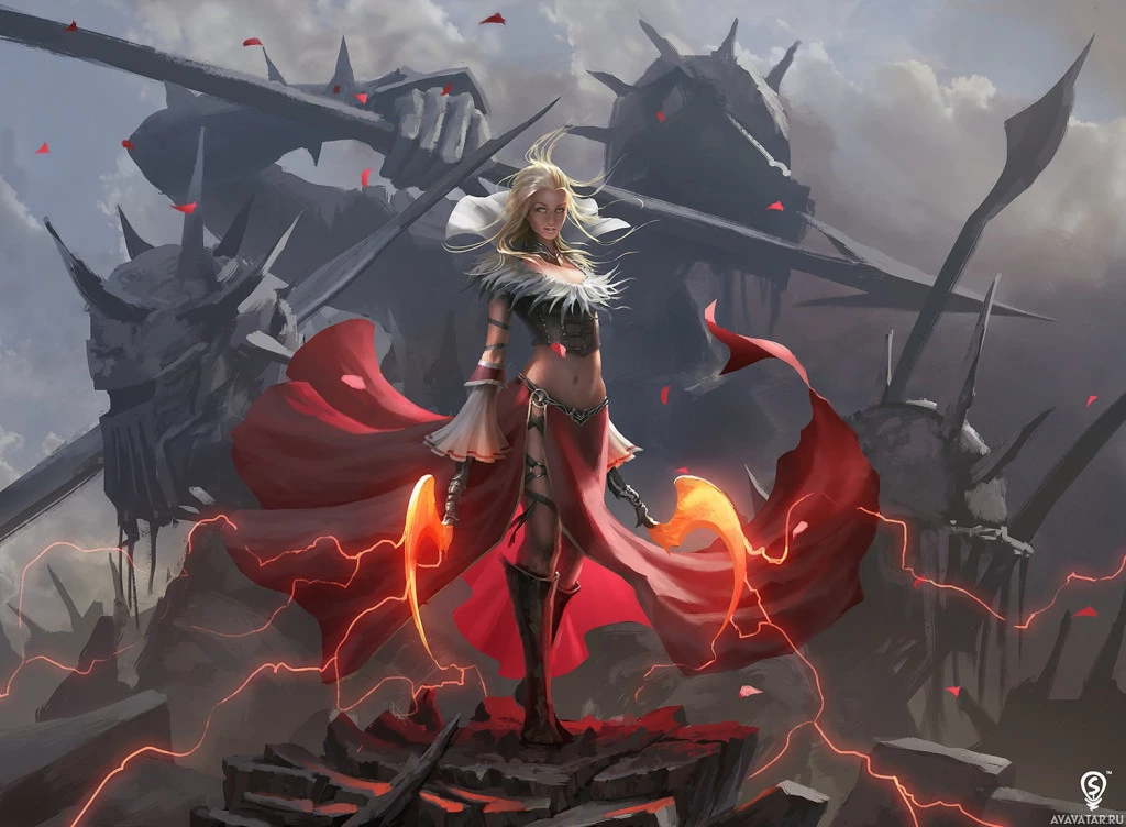 red cloak and standing on what seems to be debris or rubble, suggesting she may have been through some form of battle or destruction. Her expression is confident, and she is looking directly at the viewer, which conveys