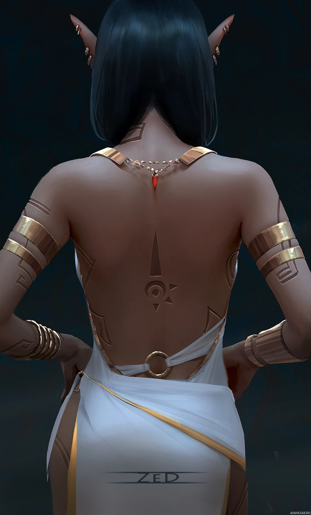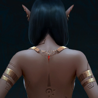 pointed ears and the design elements such as the headdress, the armor, and the jewelry. She has long