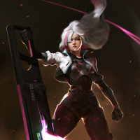white hair and is holding a large, futuristic-looking rifle with one hand. The character is depicted in
