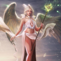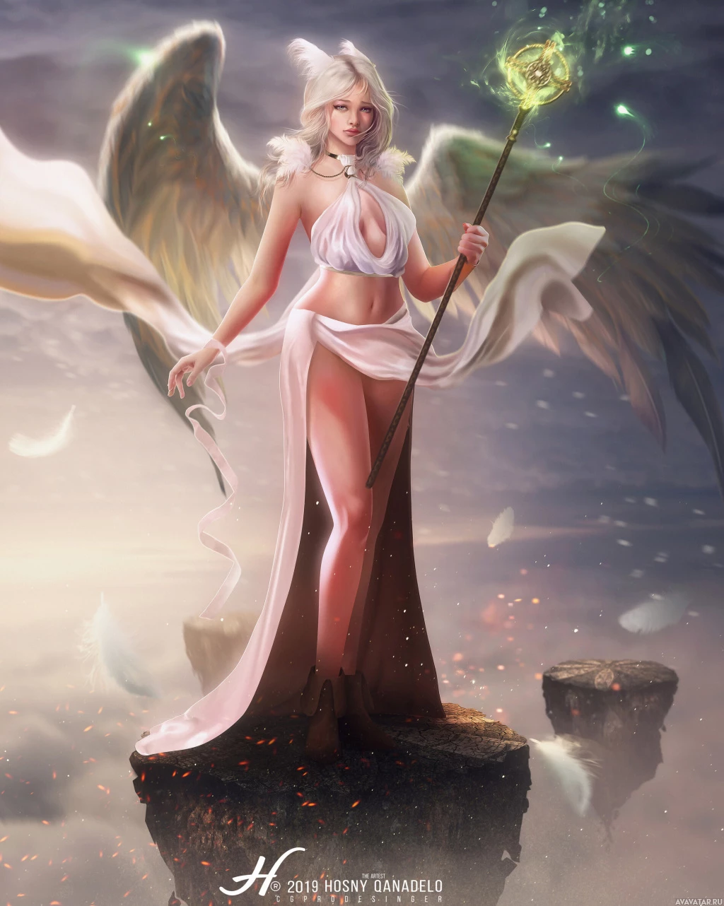 blonde hair with blue eyes, and is wearing a flowing, ethereal outfit that appears to be inspired by ancient Greco-Roman or Egyptian designs. The angel is also holding a staff with what seems to be a magical sphere on top, suggesting she might have