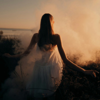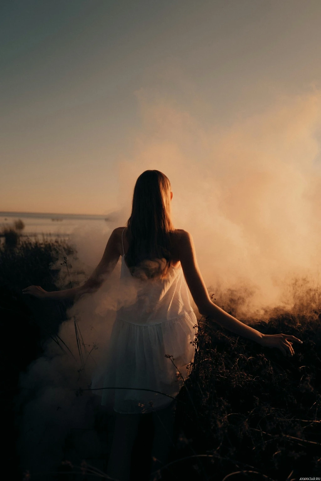 an outdoor setting at what appears to be either sunrise or sunset given the soft lighting. There is smoke or mist rising into the air around the person, creating a serene and ethereal atmosphere. The individual seems to be wearing light-colored clothing that blends with