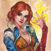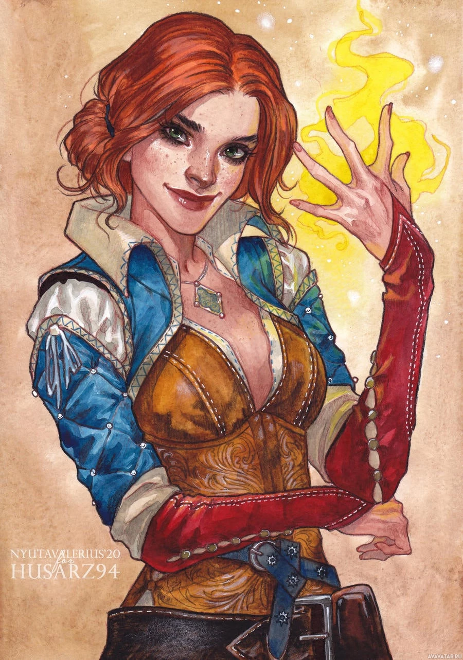 Triss Merigold from the "The Witcher" game series. She is shown in her typical attire, which includes a blue and gold outfit with a sword on her hip, reflecting her status as a powerful sorceress within