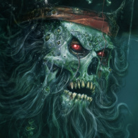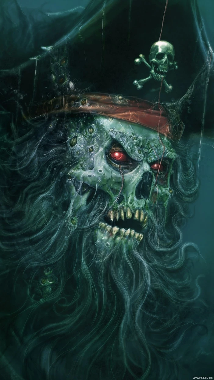 На картинке изображен фантастический персонаж, сочетающий в себе элементы зомби и пиратской тематики. На нем изображена фигура скелета с красными светящимися глазами, в пиратской шляпе, украшенной черепом и скрещенными костями, и с повязкой на глазу. Фон темный и угрюмый, что наводит на мысль о подводной или антиутопической обстановке. Персонаж излучает ощущение опасности и сверхъестественного.