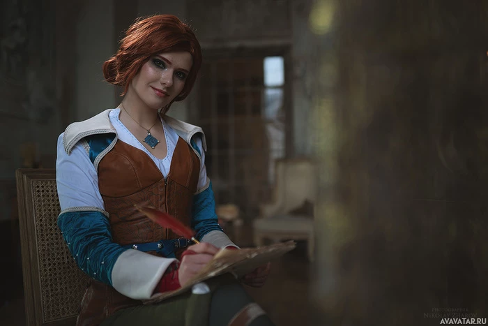 In the image, you see a person cosplaying as Triss Merigold from "The Witcher 3: Wild Hunt"
