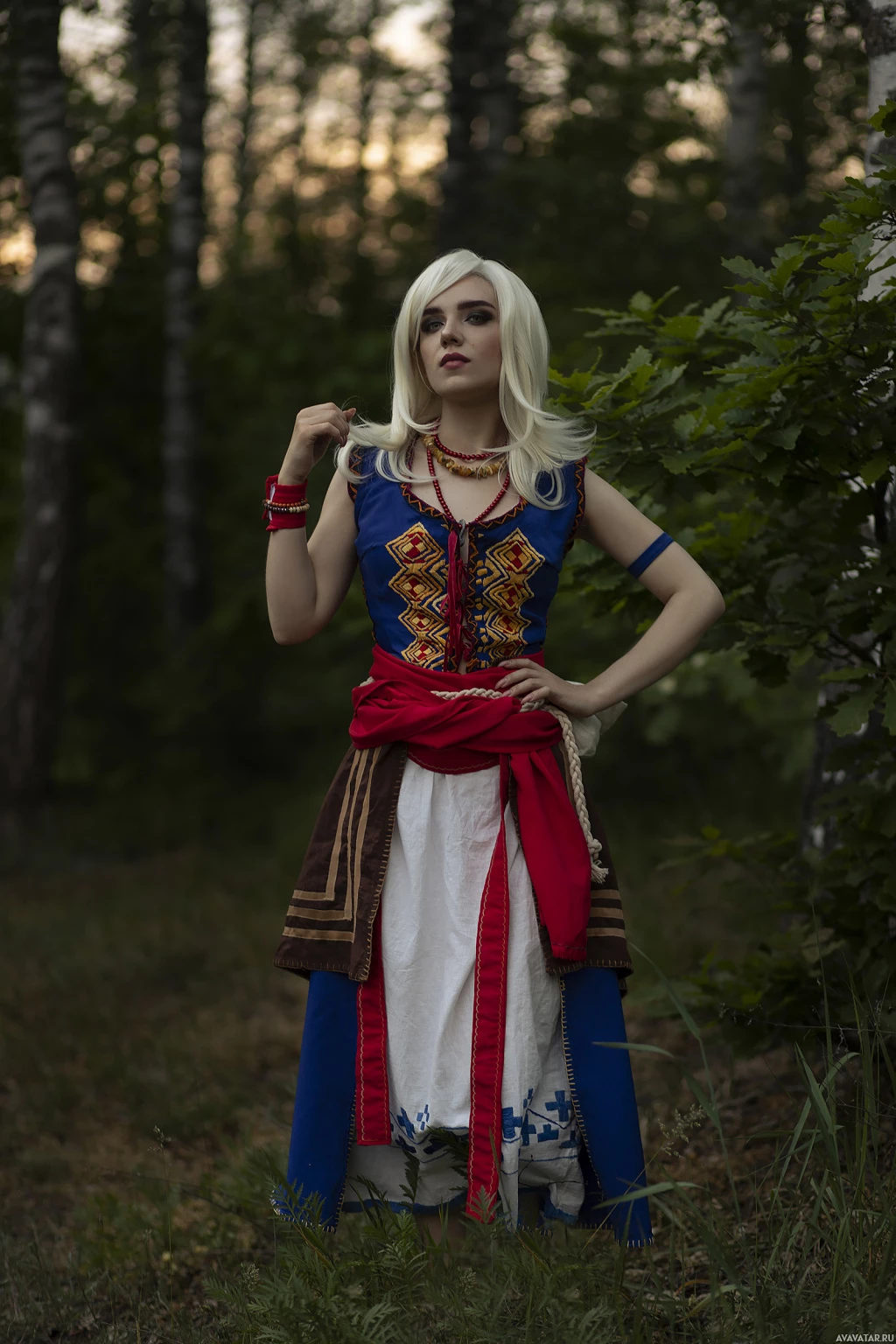 The image shows a person dressed in a costume that appears to be inspired by the game "The Witcher." The costume includes elements such as a fantasy-style dress with blue and white colors,