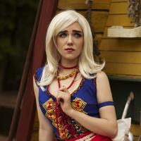 an outdoor setting with a rustic backdrop that includes what looks like a shed or barn structure. The person's pose and expression give off a character-like performance, possibly engaging in roleplaying or cosplay. The image is rich in detail and captures the essence of fantasy costume and