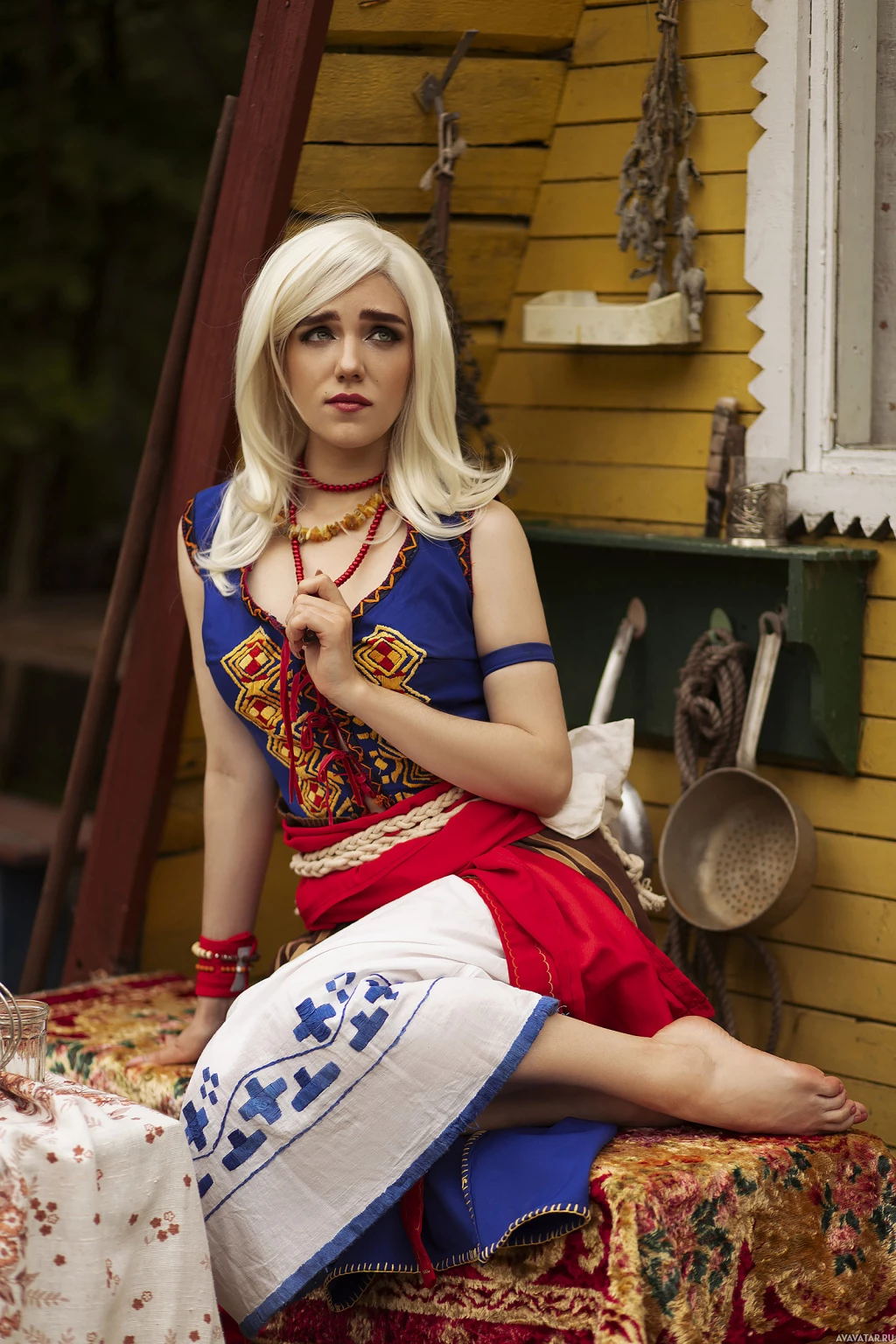 The image shows a person wearing elaborate costume makeup and clothing that is reminiscent of characters from the "The Witcher"