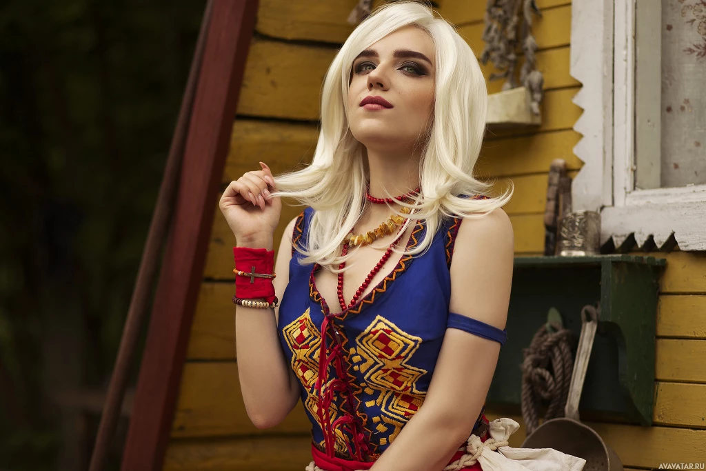 video game. The individual is wearing wig hair styled to look like Ciri's distinctive blonde braids and is accessorized with jewelry and clothing items that fit the character's style, including a bodice with