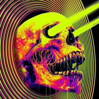 various colors such as yellow and purple. This suggests a theme related to power or intensity. The design elements around the skull include concentric circles that give the impression of sound waves or perhaps some kind of