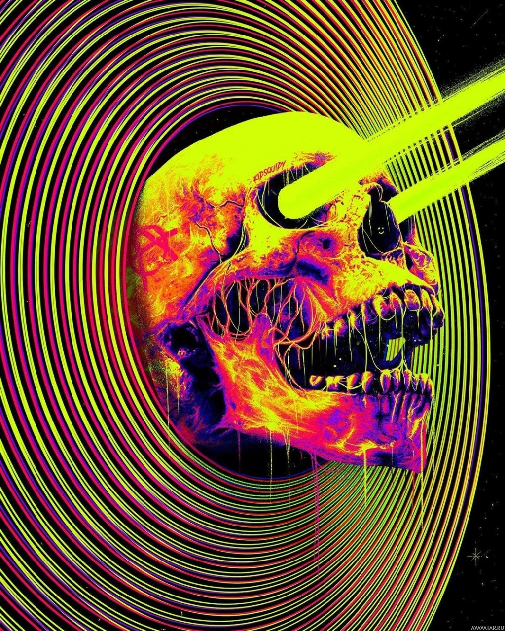 fierce expression. The skull is set against a background that appears to be pulsating or radiating energy in