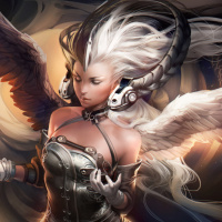 white hair and angelic wings, indicating that she may be an angel or a mythical being in the context of this artwork. The character is wearing armor, which adds to her mystical or heroic appearance. This image could be related to