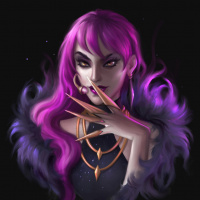 pink hair and a somewhat gothic or fantasy-inspired appearance. The character is wearing a purple garment, has a dark expression, and is holding a hand up near their face, possibly in a gesture that could suggest contemplation or