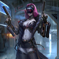 a female character with pink hair wearing futuristic armor and holding what appears to be a high-tech weapon. She is set in an environment that suggests advanced technology or