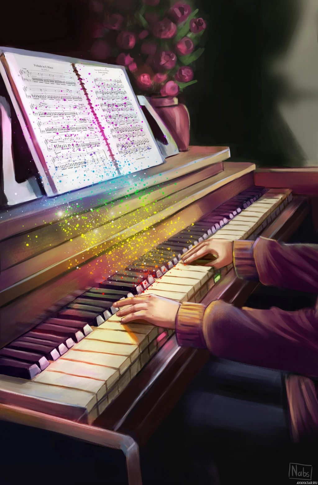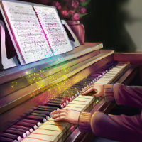 a grand piano, with music sheets open in front of them. There's an array of colorful sparkles or glitter coming from
