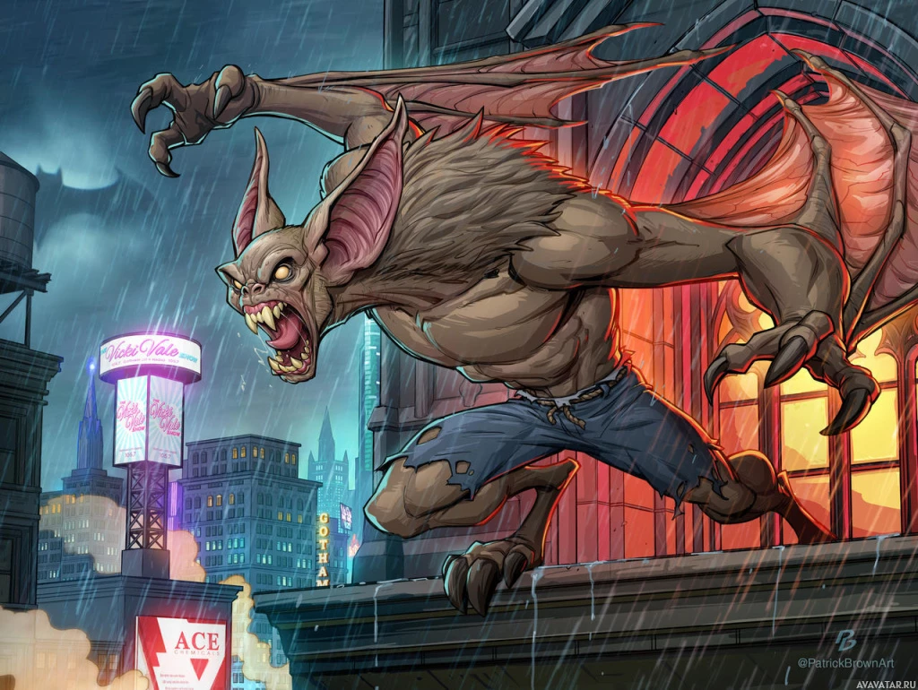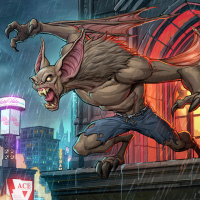 a fantasy scene featuring a creature that resembles a werewolf or some form of mythical beast with bat-like wings, standing on what appears to be a rooftop in a city at night. It's raining, as indicated by