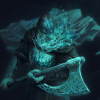 The image features a warrior in armor, holding an axe and standing next to what appears to be a ghost. The character has a fantasy-inspired design with intricate details on the armor, suggesting a scene from a fantasy story or game.