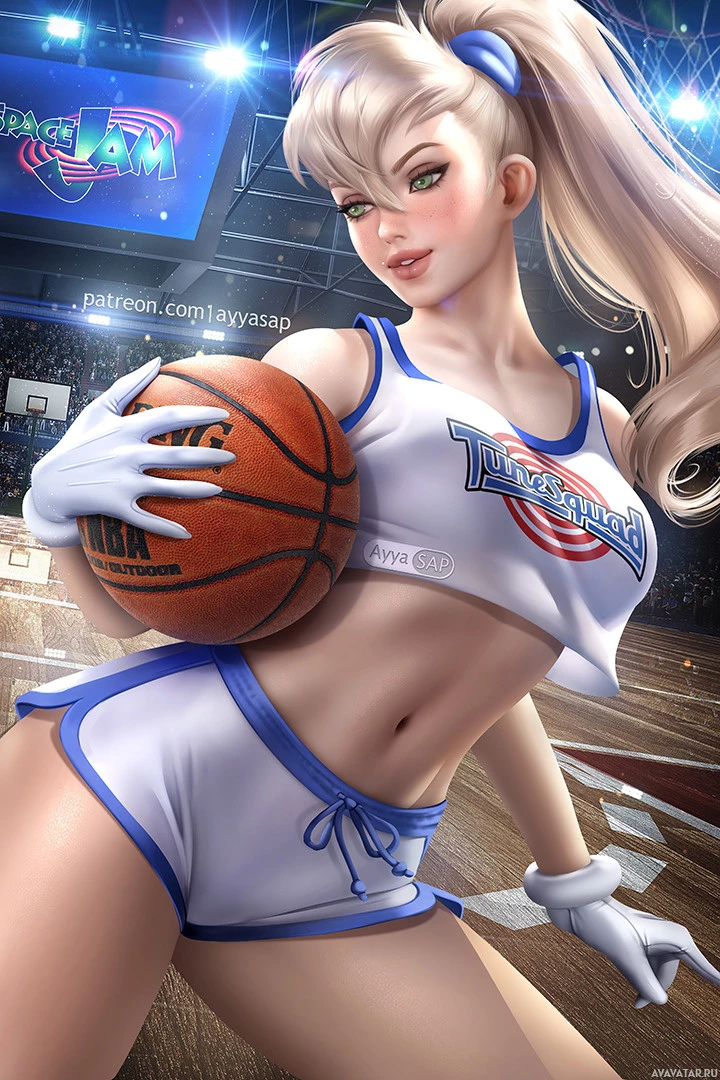 animated series. She is depicted in an athletic pose with a basketball, wearing her