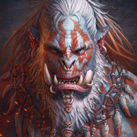 white hair, a red-tinted skin tone, and intricate tribal markings on its face, which is characteristic of such fantasy creatures. The background has a dark, smoky appearance with what seems like flames or embers, adding to