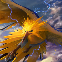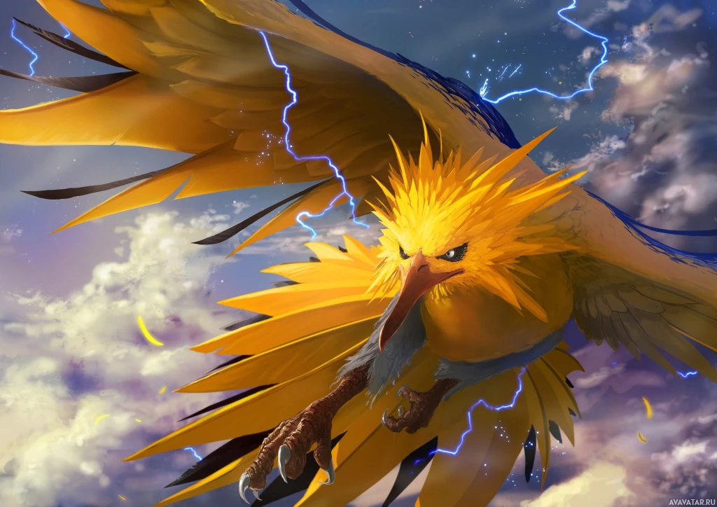 a unique design with a larger size and distinctive electric-like feathers or patterns on its wings, suggesting it might have an evolutionary form not seen in traditional Pokémon. The background features a dynamic cloud formation with