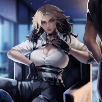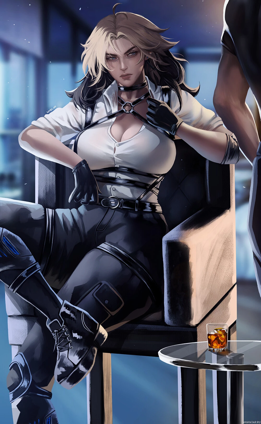 an air of confidence and readiness for action. The setting suggests a bar or casual