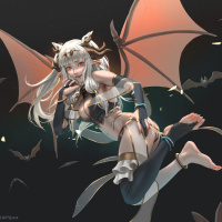 a fantasy character with white hair and what appears to be the features of a succubus, such as wings and horns. She is dressed in armor with bat-like elements, suggesting that she might have a connection to bats or bat-like creatures. The background includes