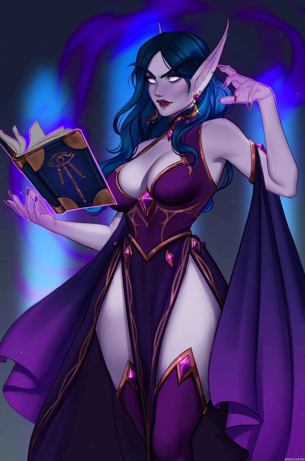 In the image, there is a character that appears to be a fantasy or drow character with