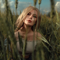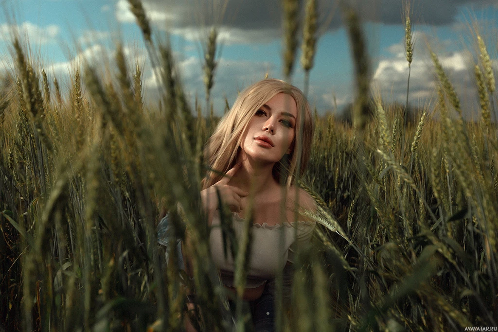 a young woman with blonde hair, who appears to be in a field or meadow. She is wearing
