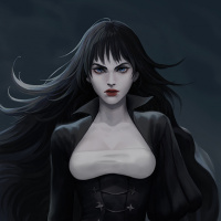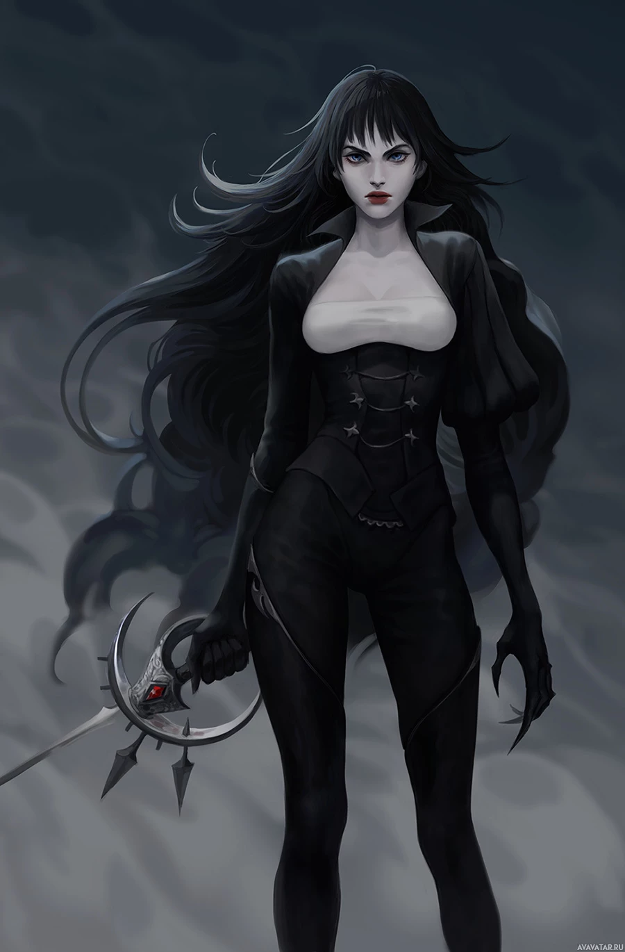 a female character who appears to be inspired by dark fantasy or gothic themes. She has long