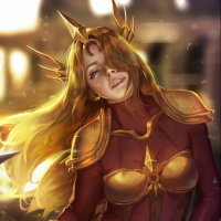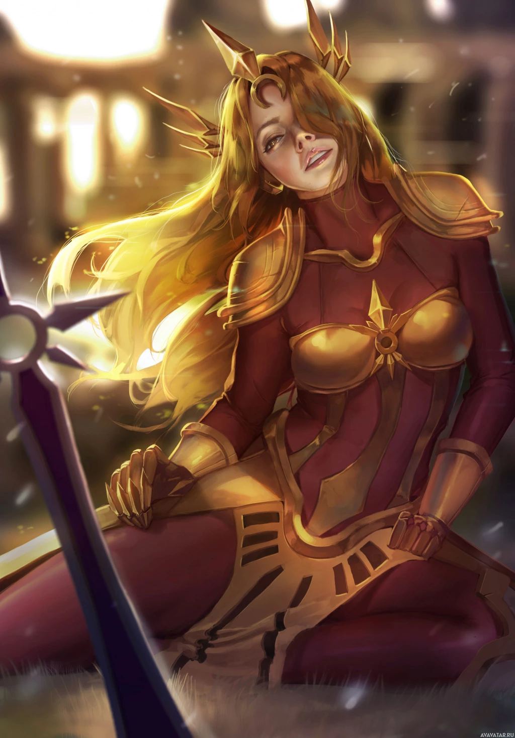 blonde hair. She is wearing armor and holding a sword, suggesting she might be a warrior or a heroine from