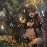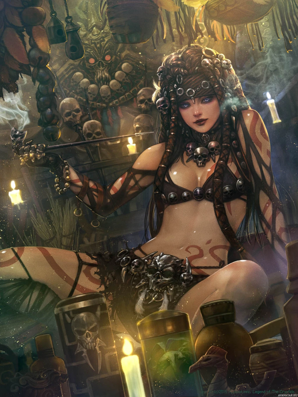 a female character dressed in what appears to be pirate or adventurous attire, complete with tattoos and accessories that suggest a fantasy or historical setting. She is seated on a pile of items including bottles and possibly other treasures, surrounded by candles that are lit and glowing, which gives the scene