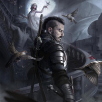 several birds flying around him, which could indicate a magical or mystical setting. The character's posture and expression convey