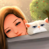 a gentle expression, and both she and the cat seem at ease in each other's company. The setting includes elements like trees and what looks like the edge of a park or garden area.