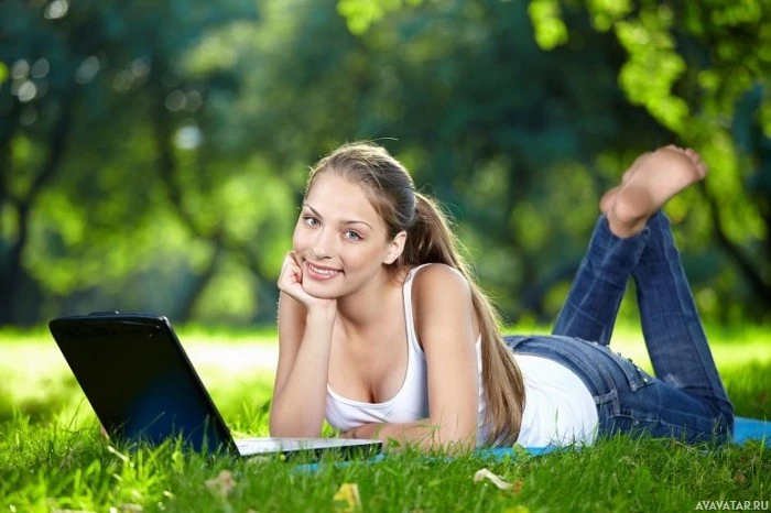 The image shows a young woman sitting on the grass and using a laptop computer. She is smiling, holding her chin with one hand, and appears to be enjoying her time outdoors while working or browsing the internet.