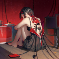 The image shows an illustrated character, a girl from behind. She has red hair and is wearing what appears to be a black outfit with some red detailing. There are wires or cables attached to her back, which suggests a science fiction theme. The background includes electronic equipment and red and black elements that could indicate a futuristic setting.