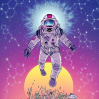 The image depicts an astronaut in space gear, floating above a barren landscape with a large full moon and starry sky in the background. There are also small plants or shrubs visible at the bottom of the image. It's a vibrant and colorful artwork that combines elements of science fiction and fantasy.