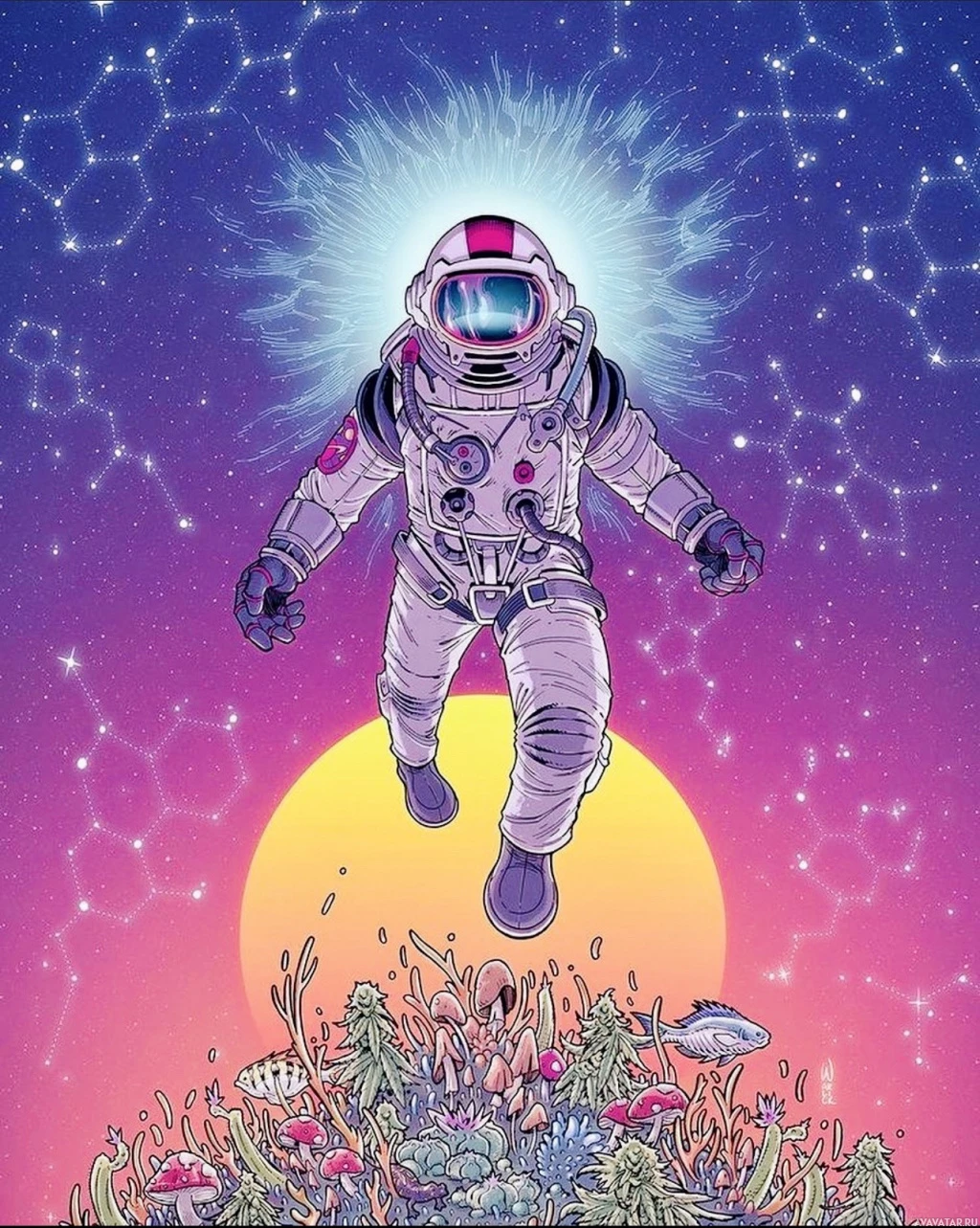 На картинке изображен астронавт в космическом снаряжении, парящий над пустынным ландшафтом на фоне большой полной луны и звездного неба. В нижней части изображения также видны небольшие растения или кустарники. Это яркое и красочное художественное произведение, сочетающее элементы научной фантастики и фэнтези.