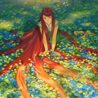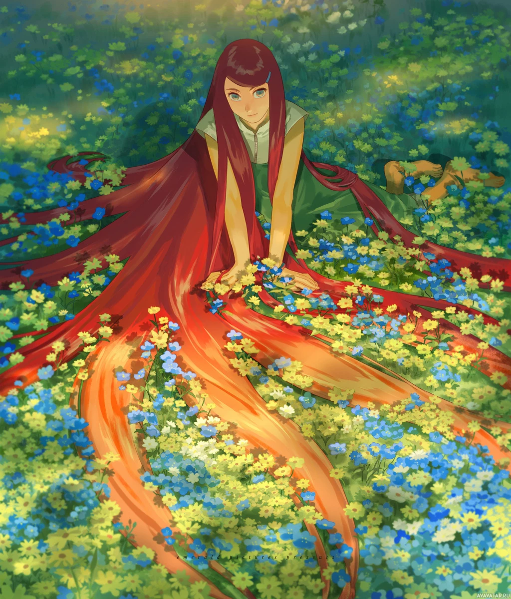 На картинке изображена анимированная девушка с рыжими волосами, сидящая на земле посреди цветочного поля. Кажется, что она со спокойным выражением лица смотрит в сторону, окруженная пышным зеленым пейзажем. Судя по ее одежде, она может быть героиней фантастической истории.