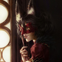 fox ears and eyes, as well as the fur on her face and hands. She is wearing a mask, which could imply she is part of a masquerade ball or event, adding