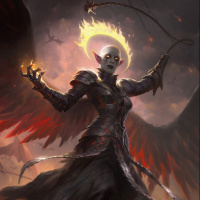 a winged figure with flames on the wings and a halo, giving it both heavenly and fiery elements. This creature is wearing a robe and holding what looks like a trident-like weapon, suggesting a role that could be angelic or demonic. The background has a dark and ominous feel to it, with hints of