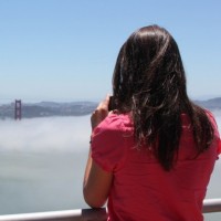 a young woman with dark hair who appears to be capturing a photo of the scenic view. She seems to be at a high