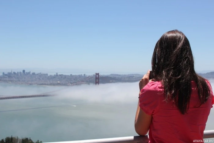 vantage point, possibly overlooking the famous Golden Gate Bridge in San Francisco, which is surrounded by fog. The image has a clear