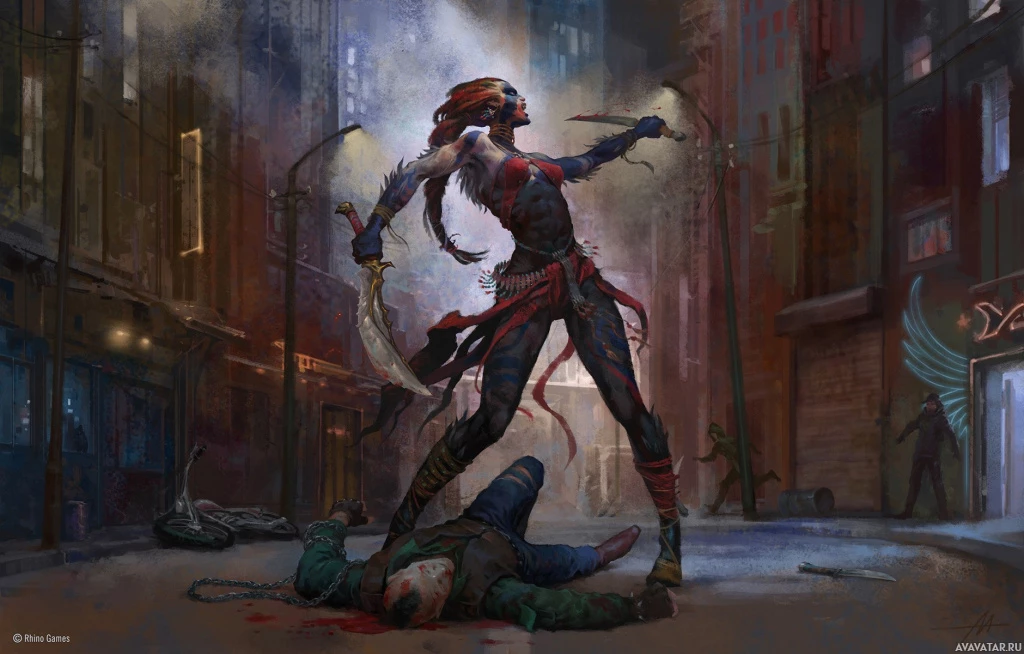 a fantasy scene set in an urban environment that appears to be inspired by cyberpunk or noir aesthetics. At the center of the scene is a figure wielding a sword and wearing elaborate, colorful attire with