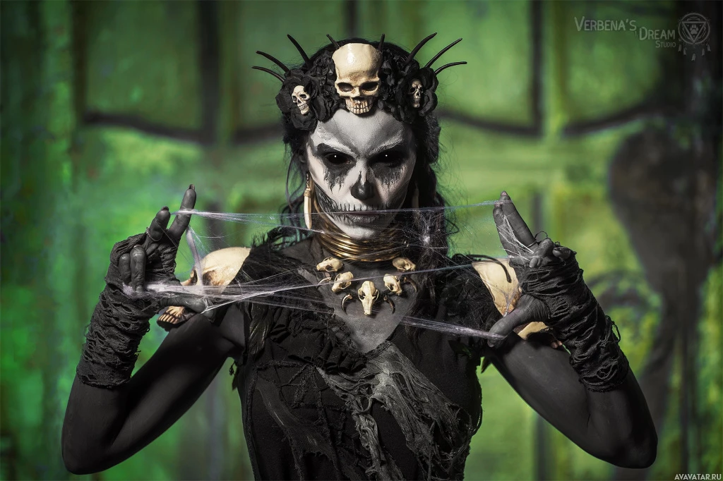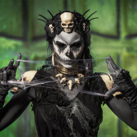 the horror genre. The individual is adorned in what looks like dark and gothic attire, possibly suggesting a connection to themes of death or the supernatural. In their hands, they are holding what could be interpreted as